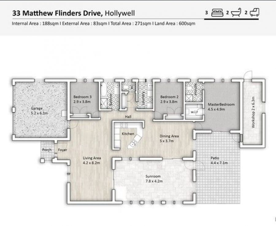 Sizable master with double glass sliders, and has a good sized walk-in robe and separate en suite. Bedrooms 2 and 3 are of a generous size and have built-in wardrobes and are serviced by a main bathroom centred between the 2 rooms.